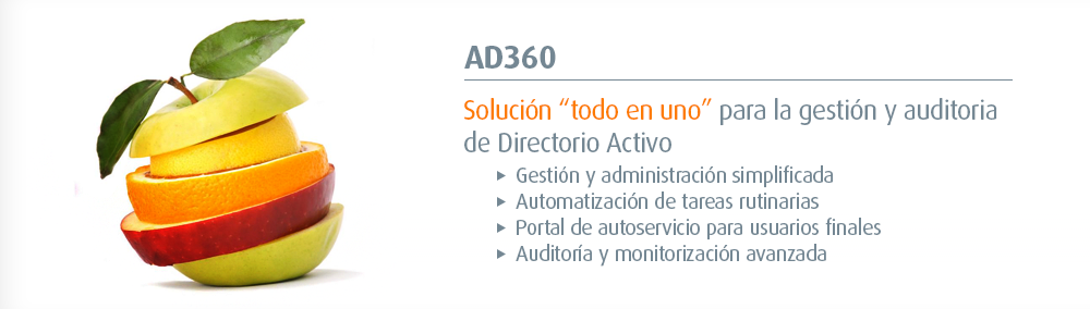 ManageEngine AD360: La solución integradaManageEngine AD360 es una solución global que integra, dentro de una consola web tipo "cuadro de mandos", diferentes aspectos de la gestión y auditoría de Directorio Activo y Exchange. Unifica todas las funcionalidades necesarias para gestionar su entorno de Windows: aprovisionamiento de usuarios, portal de autoservicio, automatización de tareas de administración, auditoría completa y mucho más. Todo ello, a través de una interfaz intuitiva y sencilla de utilizar. AD360 automatiza todas las tareas rutinarias de Gestión de Identidades y Accesos, tales como provisionamiento / desprovisionamiento de cuentas masivas de usuario y otros objetos del Directorio Activo, gestión segura de contraseñas de cuentas, modificación de atributos de cuentas, gestión de buzones de correo y el tráfico del correo electrónico. Con ManageEngine AD360, puede: